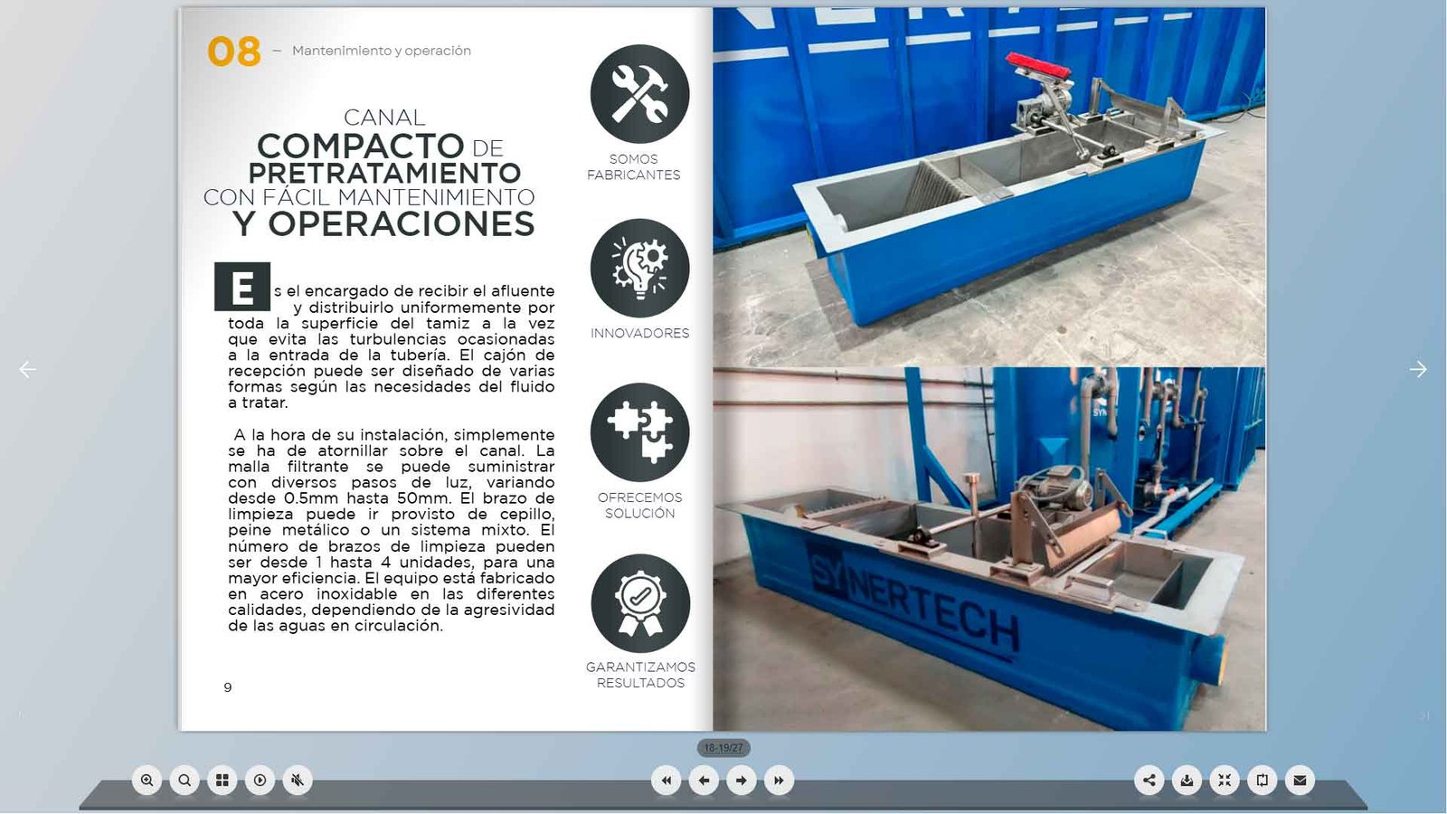 Synertech desarrolla canales de pretratamiento fabricados en acero inoxidable, ideales para optimizar los sistemas de tratamiento de aguas residuales municipales e industriales. Estos canales destacan por su altísima resistencia a la corrosión, al desgaste mecánico y a los ambientes agresivos, condiciones típicas y exigentes de la etapa de pretratamiento.